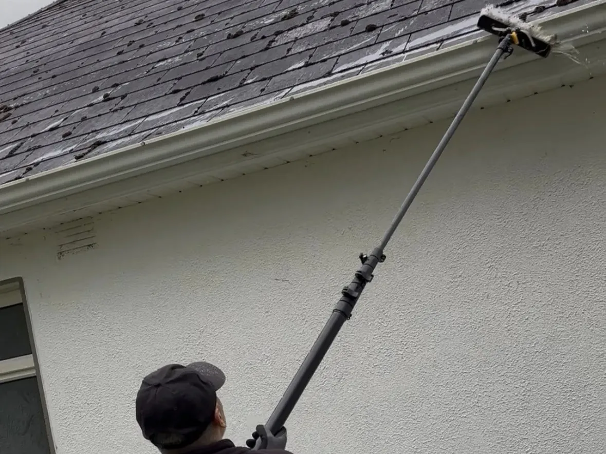 Leaves, moss, and debris are safely removed using professional equipment to ensure gutters flow freely.